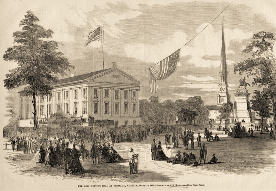 From May 1861 until April 1865, Richmond served as the capital of the Confederacy. The Capitol housed both Virginia’s General Assembly and the Confederate Congress. Confederate President Jefferson Davis and Vice President Alexander Stephens were inaugurated on the Capitol grounds in 1862. When Richmond fell in April 1865, much of the city burned, though the Capitol was spared. President Abraham Lincoln visited Capitol Square on April 4, 1865.