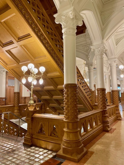 Old City Hall is a legislative building that houses various legislative agencies and commissions (capitol police, DLAS, Youth Commission, VA 250, etc). Richmond City Hall was constructed between 1886 and 1894 based on a design by the acclaimed architect Elijah E. Myers, who won a competition for the project in 1883-1884. The building occupies a full city block near the Virginia Capitol grounds and measures 170 feet by 140 feet. It exemplifies High Victorian Gothic architecture and stands four stories tall. Its striking silhouette features four corner towers, with the northwest corner dominated by a clock tower that rises to 195 feet. Built from stone, brick, and cast iron, the exterior showcases a mix of textures, particularly the locally sourced granite. It is listed on the National Register of Historic Places and recognized as a National Historic Landmark.